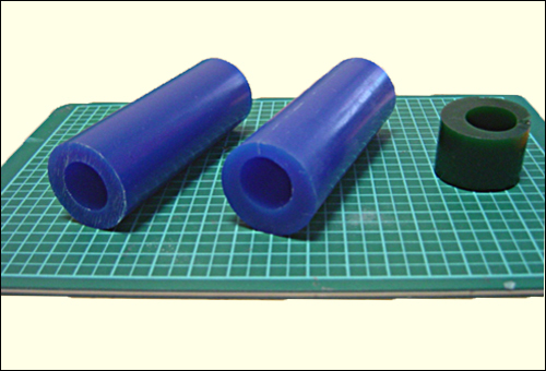 | 板状に圧縮した地金を,リングサイズや厚みに合わせてワッシャー状に打ち抜きます。 | 板状の地金 | リングの原型 |