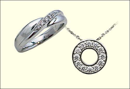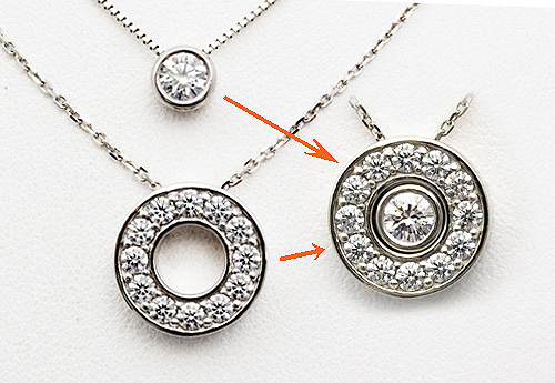 左画像のダイヤペンダントは二通りの着け方が出来る様になっております。 このようなデザインは、サークル(輪)の部分が、周りも内側も、0.何ミリの単位で真円が要求されます。そこでコンピューター技術をフルに活用した加工にて原型を作ります。 |
