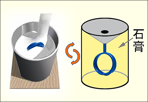 | 完成したWAX原型。 | WAX原型を液状の石膏の中に埋没させます。その後石膏を乾燥させ固めます。 | 石膏が固まった所で「炉」の中で焼き,石膏の中のWAXが 溶けて流れ出し、空洞の「雌型」が出来ます。 |