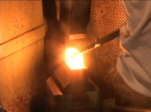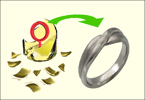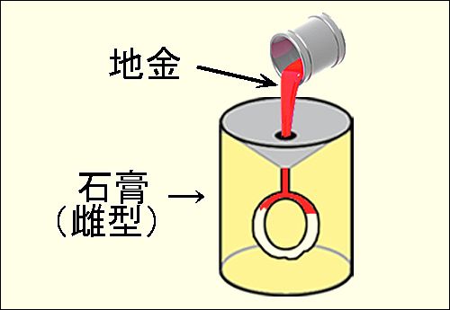 | 火で溶かした地金(プラチナや金)を石膏(雌型)の中に流し込みます。 | 地金が冷めて固まったところで石膏を砕き、中の地金を取出します。 | その後、職人の手により何工程もかけて仕上げていきます。 |