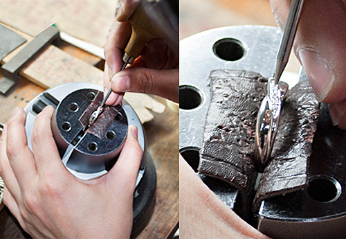 | 棒状のWAXを製品の大きさに合わせてカット。 | デザイン画を基にリングの原型を削り出していきます。 | 細部にわたり丹念に整えていきます。 |