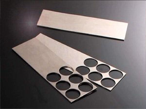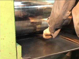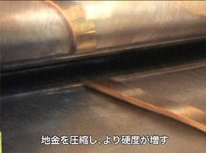 | 地金を熱して叩ことにより、「巣」ス,気泡が入らない地金になります。 | 次に地金をローラーをかけて圧縮します。 | さらに何度もローラーにかけて板状にして、より締まった地金にします。 |