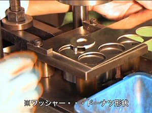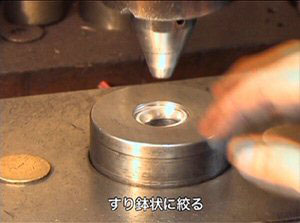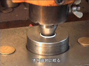 | 次にワッシャー状の原型を圧縮機により、すり鉢状に絞り込みます。 | リングを裏返し反対側からも絞ります。この「絞る」工程でさらに地金粒子の細かい、より硬いリングが出来上がります。 | この作業を繰り返すことによりリングの形になります。 |