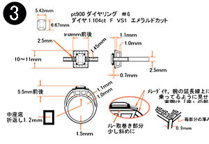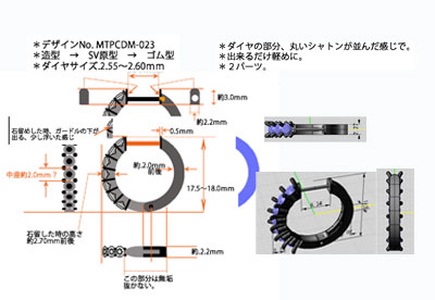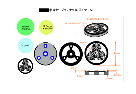 画像右)図面を基に加工。周りの淵と家紋の柄、ダイヤ部分それぞれに段差があり葉脈の所は彫刻彫りを施したのでとても立体感があります。ダイヤTotal.0.705ct使用。